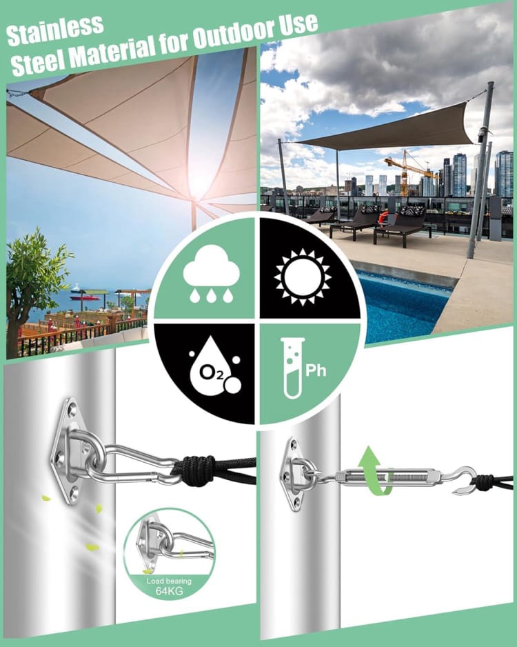 * Wide Range of Uses: This sun shade hardware kit is not only a great choice for installing shade sails, it is suitable for triangular, square and rectangular sails. The DIY sun shade kit can also be widely used for decorative ropes, clotheslines, outdoor light strips, garden fences, etc.