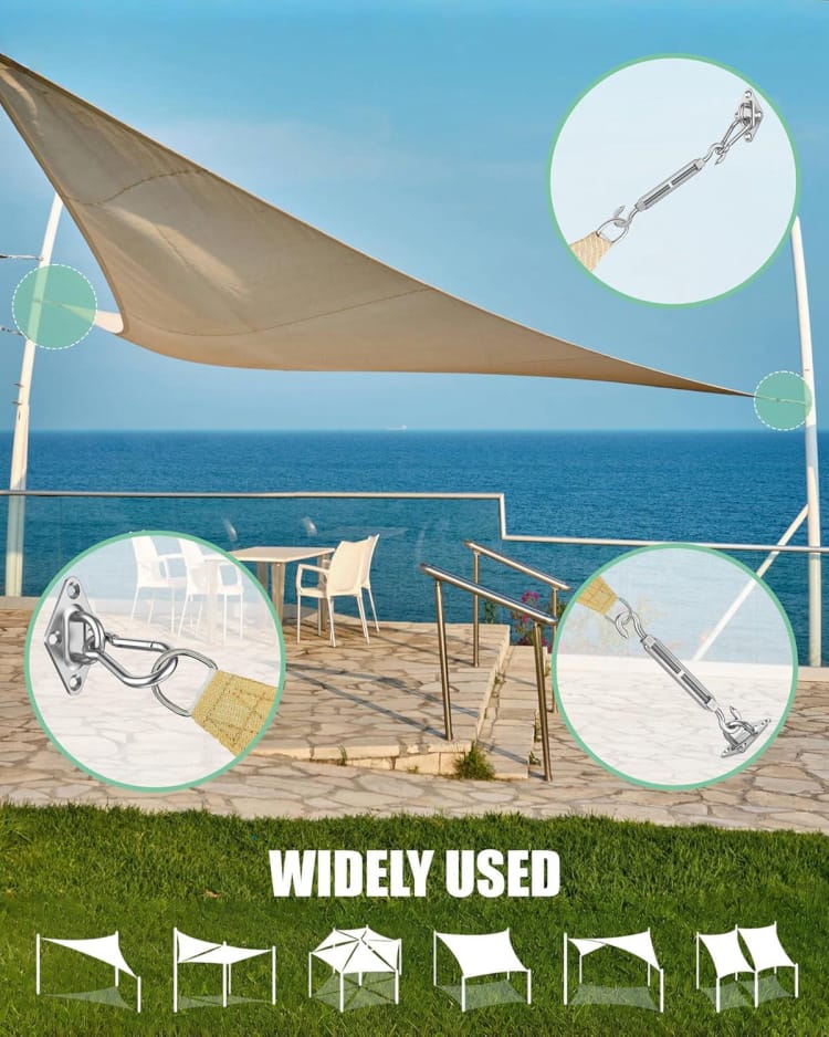 * Wide Range of Uses: This sun shade hardware kit is not only a great choice for installing shade sails, it is suitable for triangular, square and rectangular sails. The DIY sun shade kit can also be widely used for decorative ropes, clotheslines, outdoor light strips, garden fences, etc.