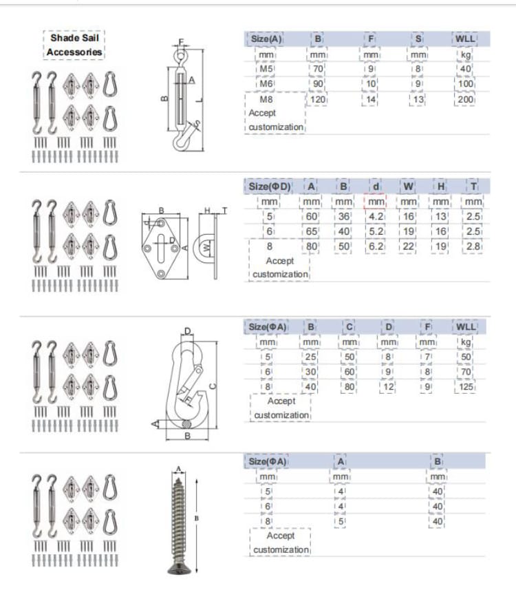 * Military Grade 304 Stainless Steel: The shade sail hardware kit is mainly made of heavy-duty 304 stainless steel, which has excellent anti-rust and anti-corrosion performance.