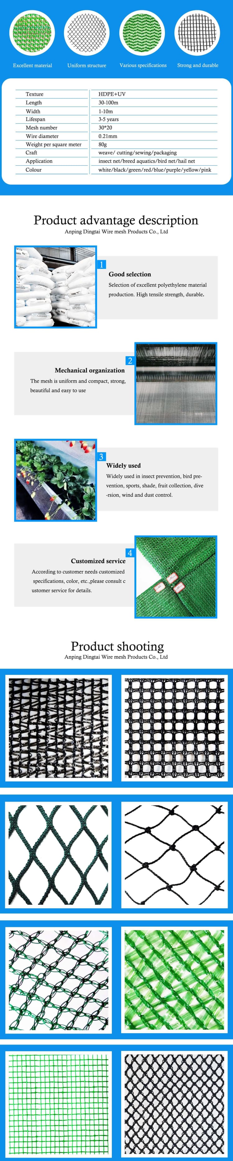 Specification Product nameanti bird net/chicken fence netting/deer fence net/anti mole netMaterialNew PE/PP material with UVColorBlac