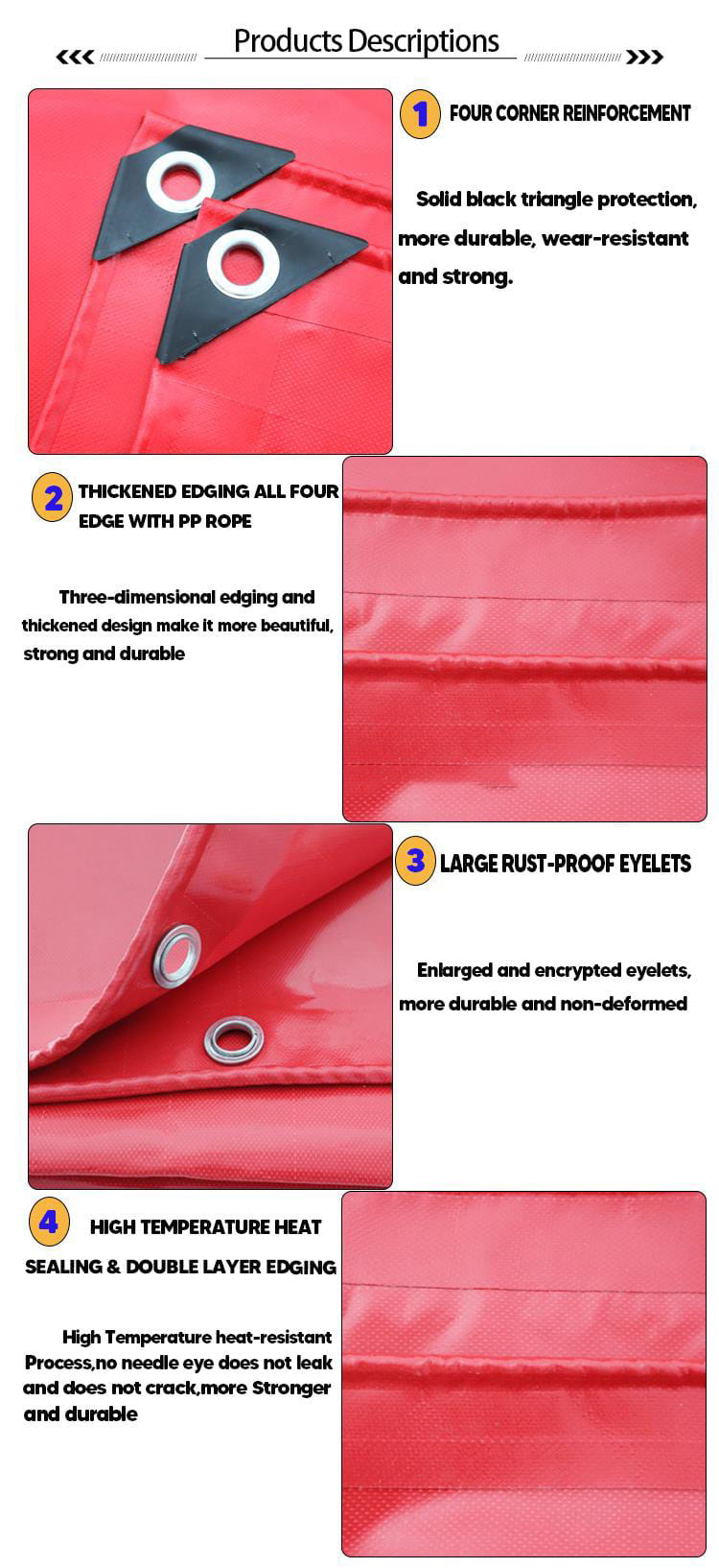 | PRODUCT TYPE | Finished Tarpaulin | 1. All four edges reinforced with PP rope in hem; 2. Aluminum eyelets every 3ft or 1 meter interval 3. Reinforced black corners applicable 4. Regular size: 2x3m, 3x4m, 4x5m, 4x6m, 6x8m, 6x10m, 8x12m or 6x8ft, 8x10ft, 10x12ft, 10x18ft, 12x18ft, 18x24ft, 20x30ft | |