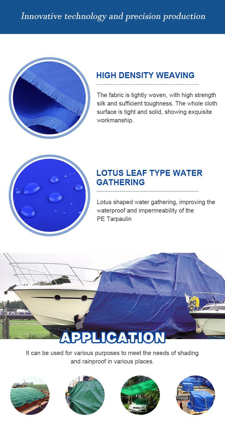 Products Description NamePE TarpaulinMaterialPolyethylene(HDPE Weave+LDPE Coating)Colordouble blue、double white、double bl